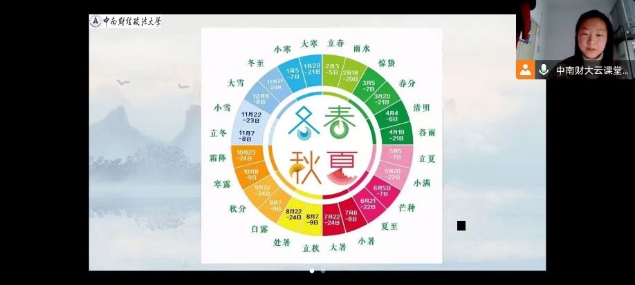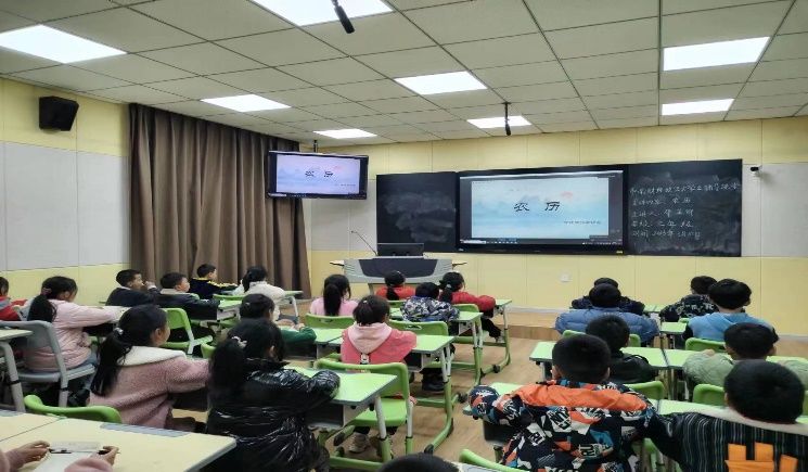 随后,邓芷卿以时间为度,向同学们逐个详细地介绍了每一个节气,从春生夏长到秋收冬藏。立春,开始风和日暖、万物复苏;雨水,忽冷忽热,乍暖还寒;惊蛰,春雷乍动,万物生机盎然;春分清明,草木萌动,阳光明媚;谷雨时节,正所谓“春雨贵如油”,降雨充足而及时,谷类作物茁壮成长。每一个节气,邓芷卿都结合PPT上的节气图片以及节气名,带领同学们一起分析不同节气的气候特点以及自然交替规律。当然,邓芷卿也会结合一些耳熟能详的谚语、古诗,加深同学们对此节气的印象,比如,“清明时节雨纷纷,路上行人欲断魂。”介绍完春天的节气,邓芷卿紧接着向同学们讲解了“夏满芒夏暑相连”的盛夏、五谷丰收的暖秋和风雪不断的寒冬。