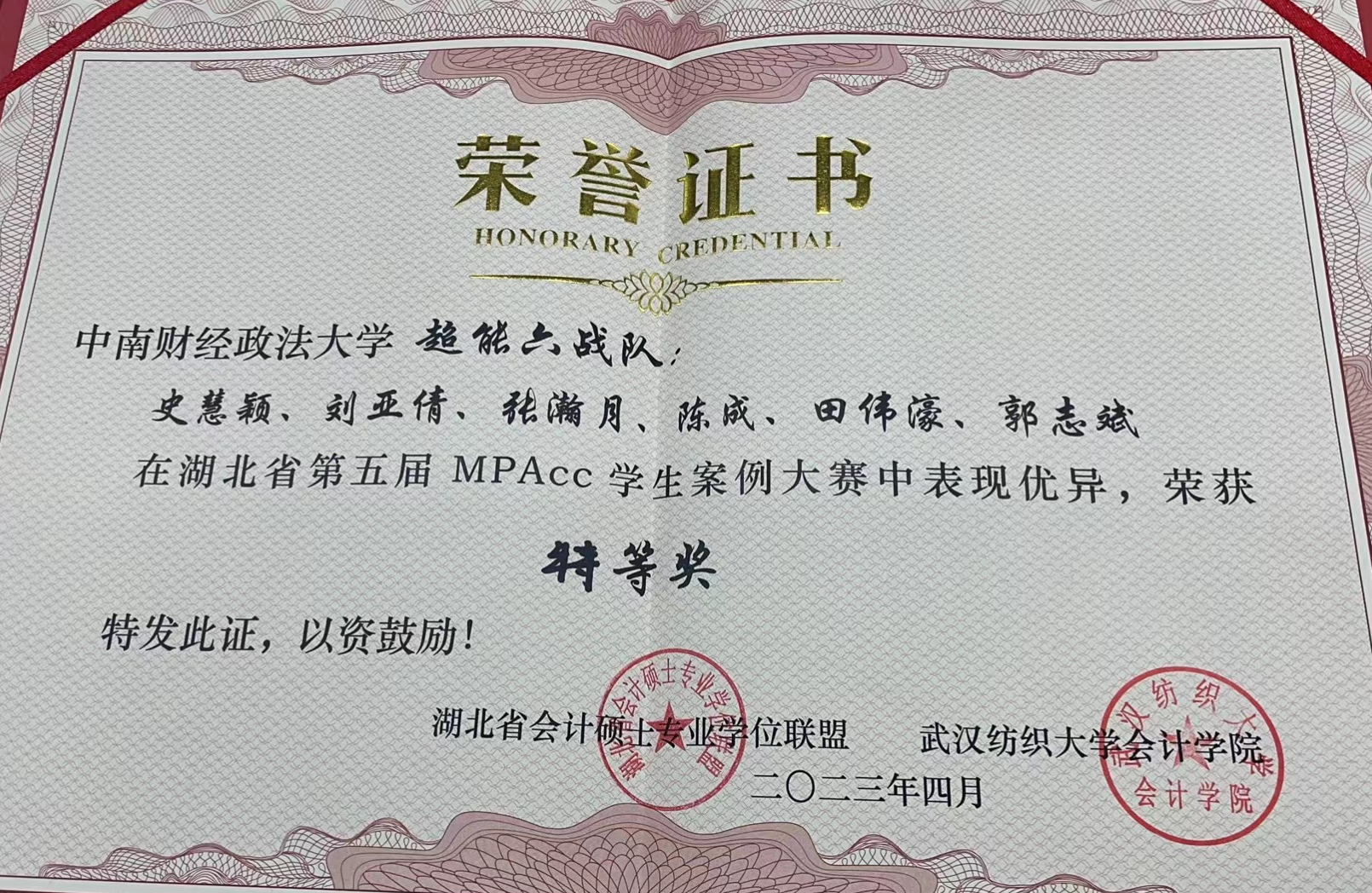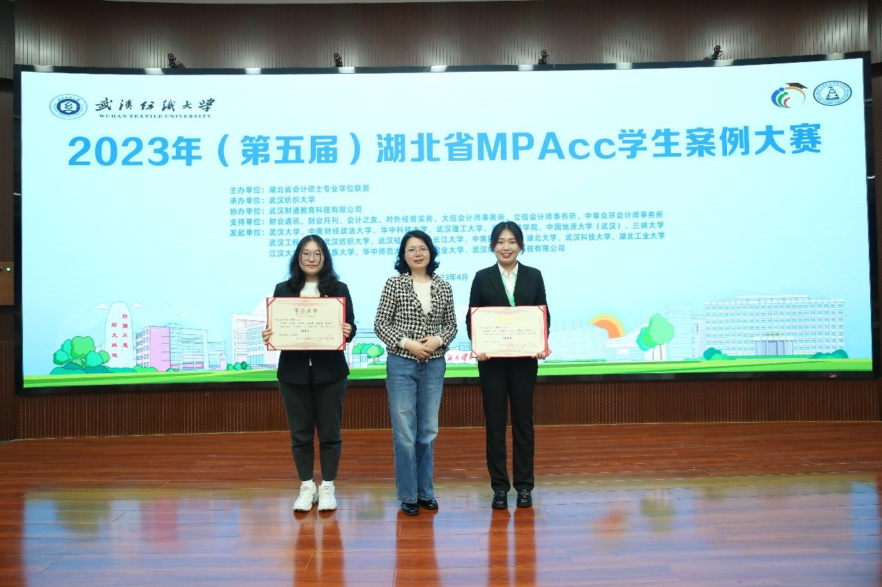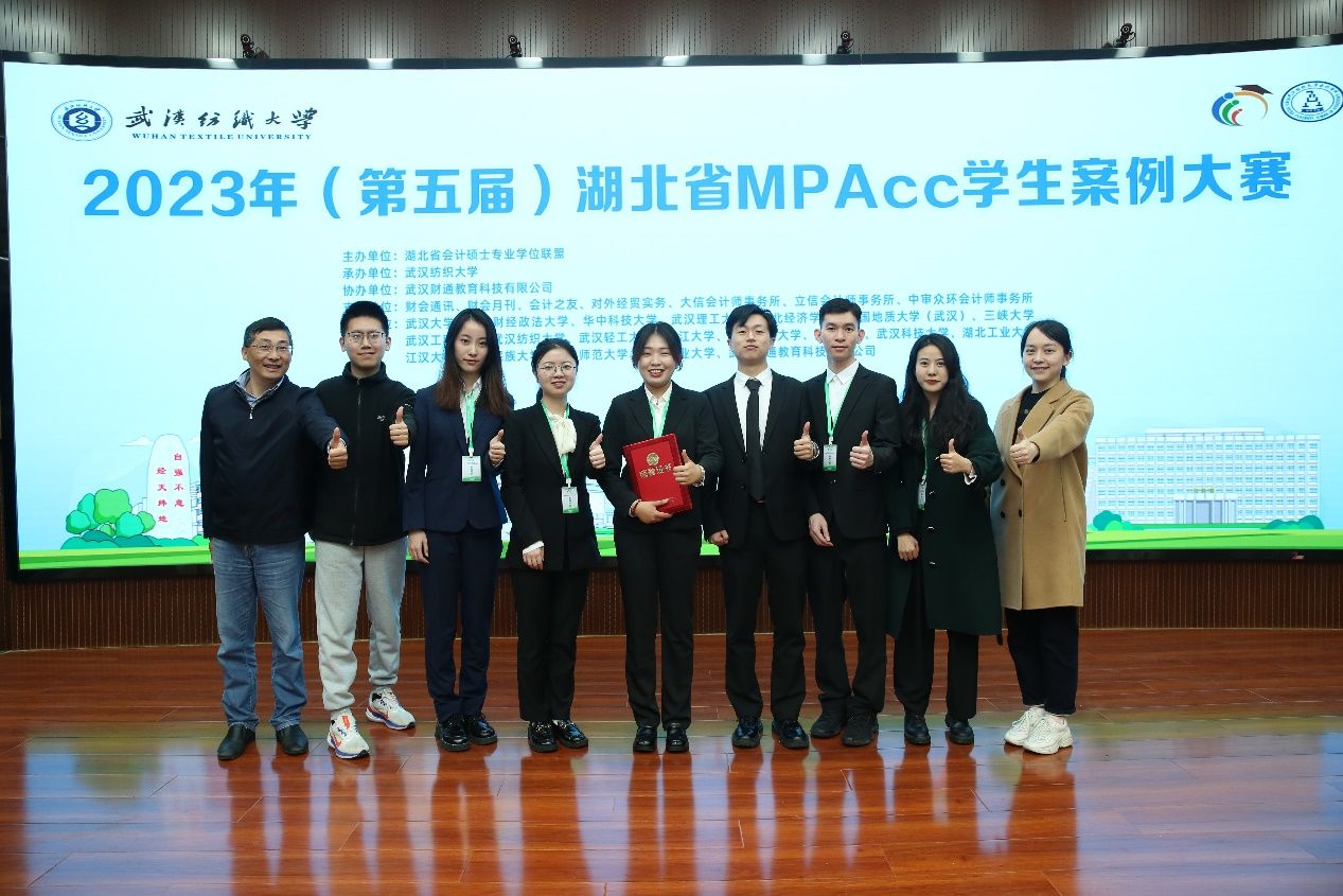 2023年4月22日至23日,2023年湖北省第五届MPAcc学生案例大赛复赛和决赛在武汉纺织大学举行。在张敦力院长、殷修林书记的正确领导,会硕中心主任兼副院长王昌锐的统筹安排,以及会计硕士导师组的指导下,由我院(中心)2022级会计硕士研究生史慧颖、刘亚倩、张瀚月、陈成、田伟豪、郭志斌等6位同学组成的“超能六战队”在王嘉鑫副教授的直接指导下,获得2023年湖北省第五届MPAcc学生案例大赛冠军并实现五连冠。