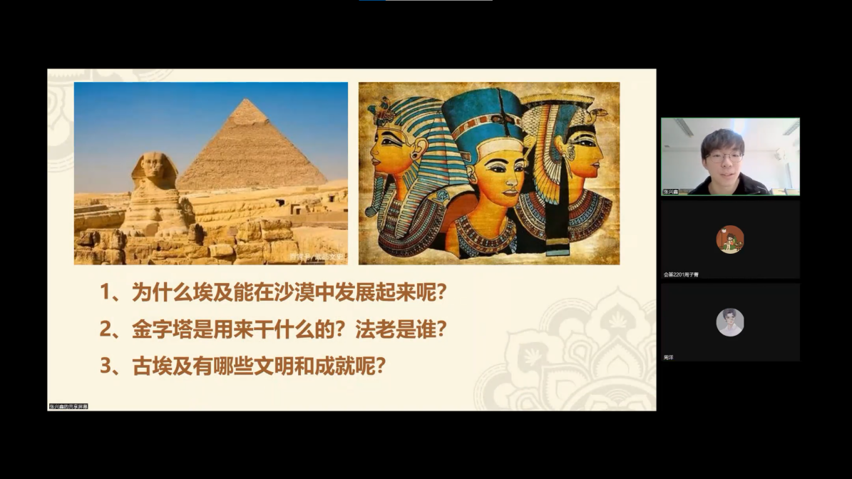 2023年3月30日下午4点30分,yh86银河国际四年级云课堂第二小组通过腾讯会议为箭坝小学四年级学生进行时长一小时的四大文明古国课外历史课,主讲人张兴鑫、周子菁。