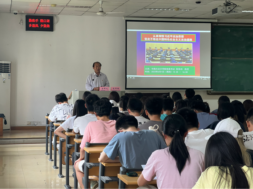 (通讯员 范纯琍、黎玥) 为进一步宣传党的二十大精神,推进学习贯彻习近平新时代中国特色社会主义思想走深走实,更好落实党的最新理论进教材、进课堂、进头脑。6月1日下午,yh86银河国际党委书记殷修林教授在首义校区文润楼303教室与200多名会院学子“同上一堂思政课”,课程主题为《认真领悟习近平法治思想 坚定不移走中国特色社会主义法治道路》。中南财经政法大学学习贯彻习近平新时代中国特色社会主义思想主题教育督导组第三工作专班组长胡海南部长,组员卫瑾老师和银河辅导员参与此次思政课。此次思政课由银河辅导员范纯琍教授主持。