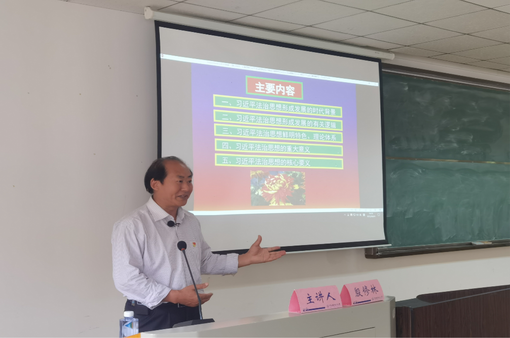 进入课程主体,殷修林为与会学子详细阐述习近平法治思想。殷修林指出,习近平法治思想萌发和孕育于改革开放和社会主义现代化建设新时期,形成和发展于坚持和发展中国特色社会主义新时代,深化和拓展于全面建成社会主义现代化强国新征程。殷修林强调,习近平法治思想发展于长期实践基础、科学理论探索、深厚历史涵养,体现了实践逻辑、理论逻辑、历史逻辑内在融贯、有机统一。