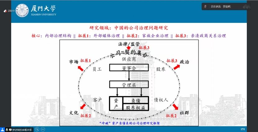 接着,罗进辉教授再从公司制企业的现代企业制度展开讲述公司治理的治理对象以及其存在的重要意义。现代公司制企业有四个主要特点:法人资格、有限责任、股份化、经理人的职业化。罗进辉教授用案例解释公司制企业由其特性而带来的正反两面性,循序渐进引出公司治理重要意义。随后,罗进辉教授便从这四个方面具体展开,强调公司治理的研究框架正是围绕着公司制企业的这几个主要矛盾展开,同时结合自己的研究思路,逐步厘清公司治理现有研究的热点话题的由来,梳理公司治理研究的脉络框架,为同学们指明寻找研究方向的思路。