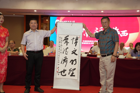 武汉校友会会长曾雪萍带来了他亲笔题写的“博文明理、厚德济世”的校训墨宝。