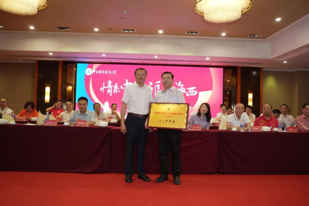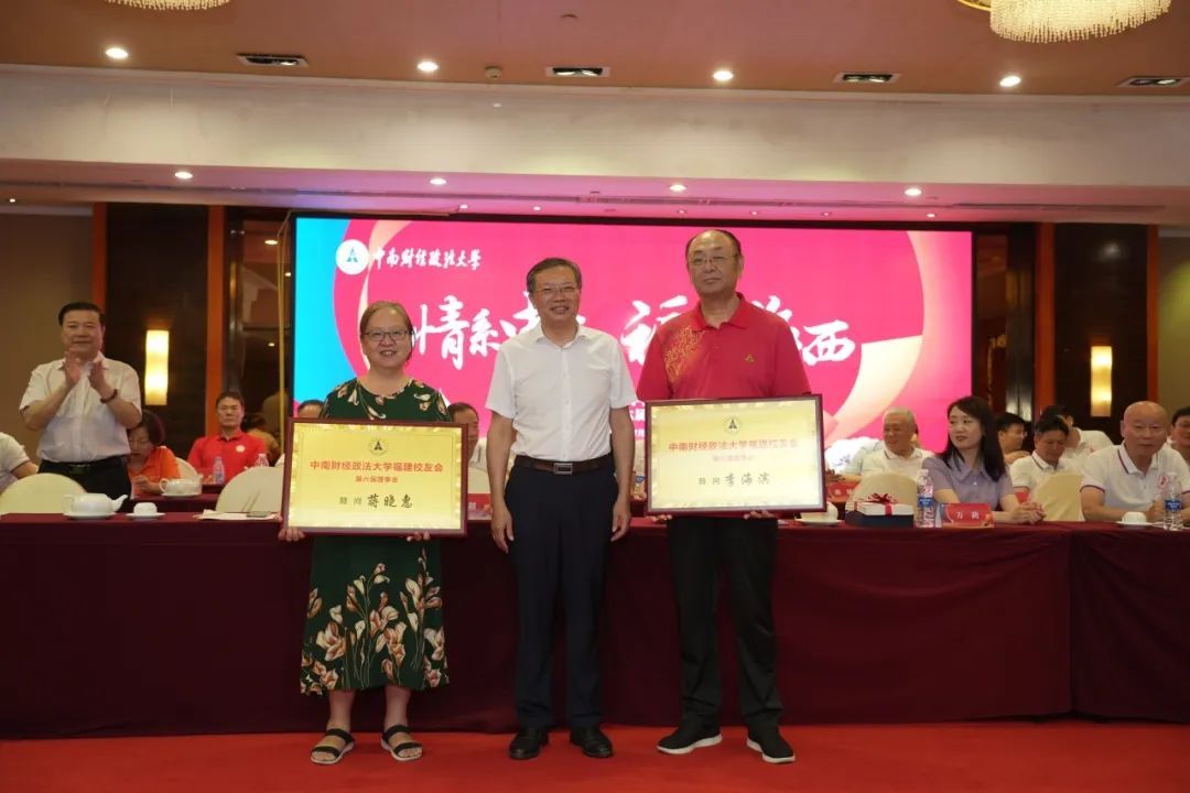 中南财经政法大学党委常委、副校长覃红为到会的两位第六届理事会顾问李海滨、蒋晓惠授牌,为第六届理事会会长严信发授牌。