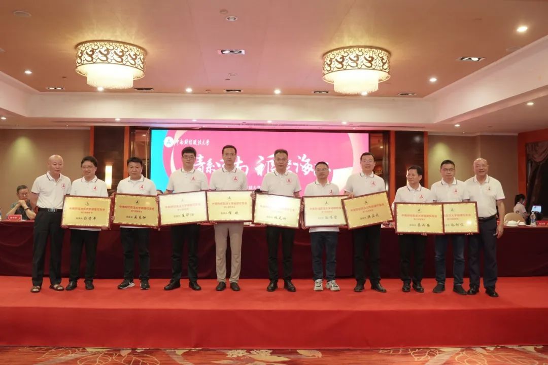 yh86银河国际党委副书记、纪委书记兼行政副院长徐会超、福建省外大学校友会联合会秘书长黄伟平为到会的常务副秘书长吴君茹、副秘书长林本寿、乔江伟、林楠冰、理事黄文彬、张锦洲、李普齐授牌。