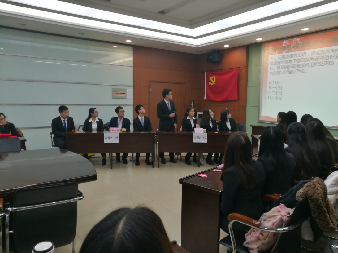 参加决赛的选手们均经过层层选拔,分别从2014级本科生党支部及2015、2016级研究生党支部成员中脱颖而出。7:00,比赛正式开始。大赛共分两个环节:问答环节和抢答环节。比赛题目涵盖了党的十八届五中全会、“三严三实”专题教、,《中国共产党廉洁自律准则》、《中国共产党纪律处分条例》等。