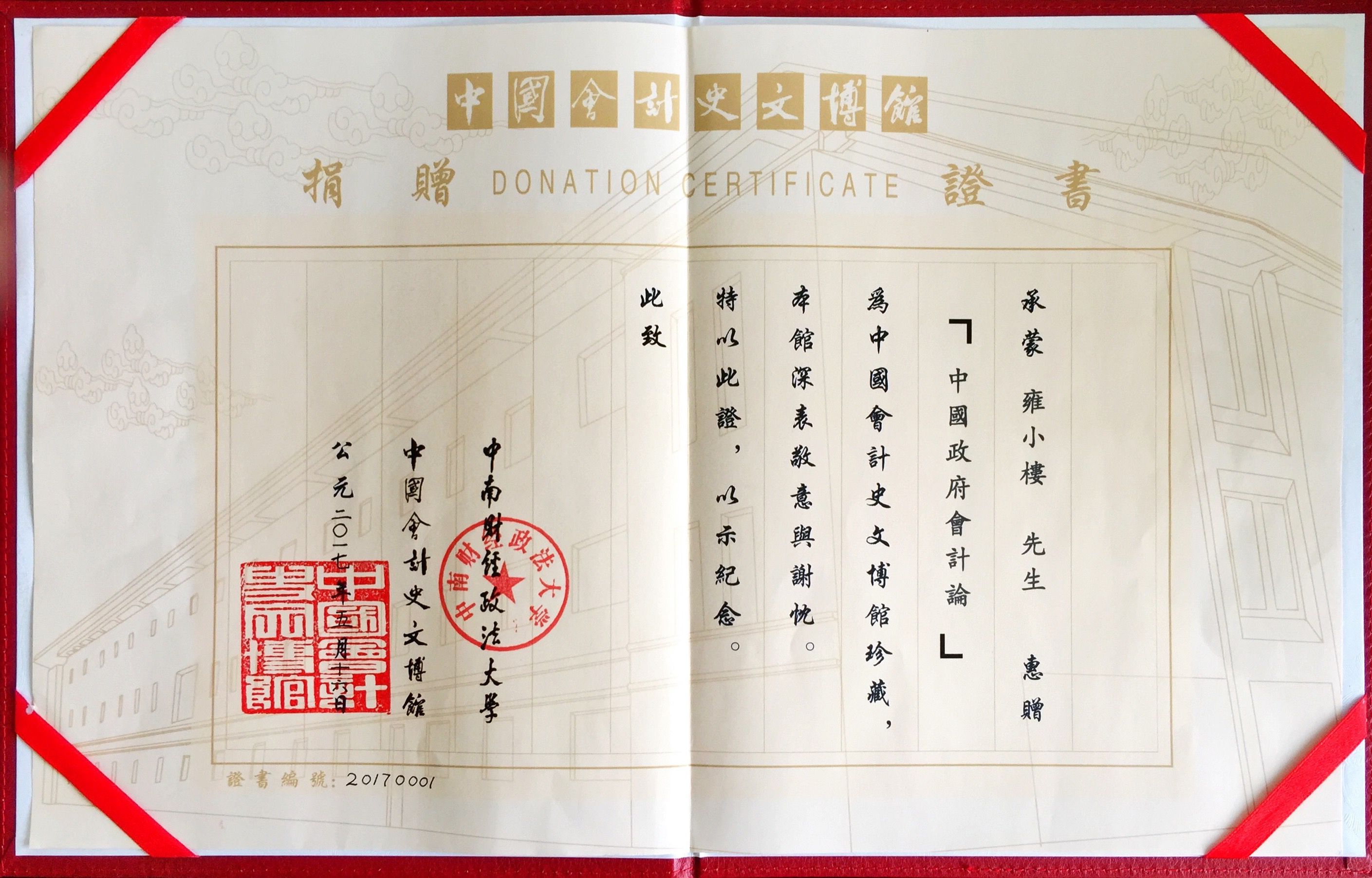 (通讯员 冉明东 徐会超 张亚星)在听闻我校筹办“中国会计史文博馆”的消息之后,雍家源先生的长子雍小楼先生与郭道扬教授联系,慷慨捐赠了其父亲创作的中国第一部政府会计著作——《中国政府会计论》,该书对于中国现代会计发展史的研究具有重要价值。此为“中国会计史文博馆”第一份捐赠,本馆向雍小楼先生致以最崇高的敬意!