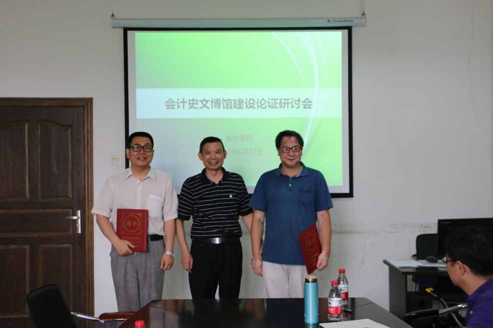 随后,研讨会在文泉南305会议室召开,肖翠祥书记向宋小明、杨智杰两位教授颁发聘书,聘请其担任中国会计史文博馆筹备委员会委员,指导文博馆中外会计历史文献文物收集、布展设计等工作,肖书记向宋、杨两位教授表示欢迎和感谢。接着,宋小明教授、杨智杰教授分别从会计史文博馆筹建的必要性、建设进程、布展思路、宣传和资金筹措等方面给予了实际而中肯的建议。