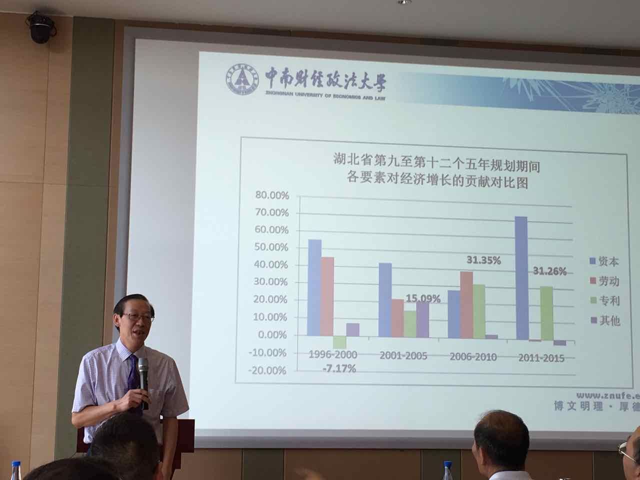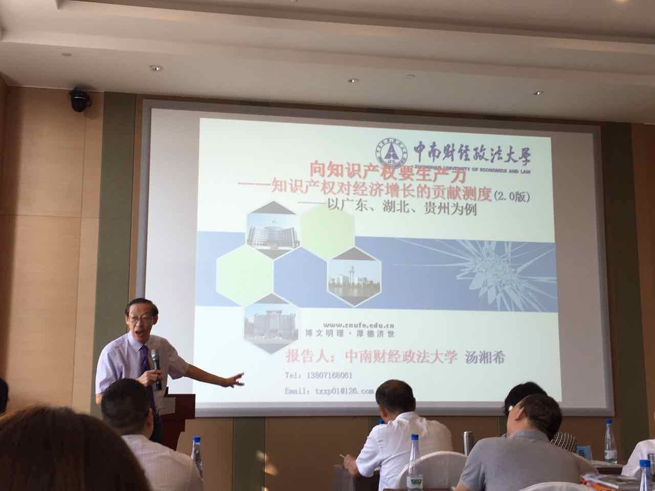 本次研讨会主要采取专题演讲的形式进行。在大会安排的七个专题演讲中,我院汤湘希教授以“向知识产权要生产力——知识产权对经济增长的贡献测度”为题进行了大会报告。汤教授提出了如何客观、准确地测度区域知识产权能力,评价知识产权对区域经济增长的贡献,并对知识产权指数的构建进行了深入的分析,最后根据科布—道格拉斯函数推推导出资本、劳动、知识产权等因素对经济增长的理论模型。并以广东省、湖北省、贵州省作为我国东中西部省份的代表,具体测度了1996~2015年20年间知识产权对经济增长贡献的具体比例,并且进行了横向和纵向的综合比较分析,明确提出了“向知识产权要生产力”,为国家探索知识产权强国路径、区域发展重点培育的战略性产业、以及产业结构优化升级提供理论依据与实践经验。