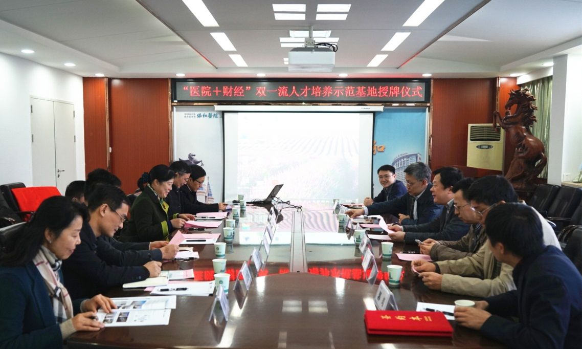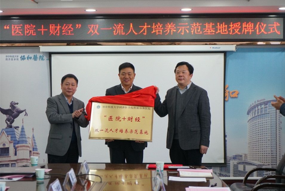 银河张敦力院长主持双方签约以及揭牌仪式。我校杨校长和协和医院胡院长签订了《“医院+财经”双一流人才培养示范基地共建协议书》,并共同为双一流人才培养示范基地揭牌。