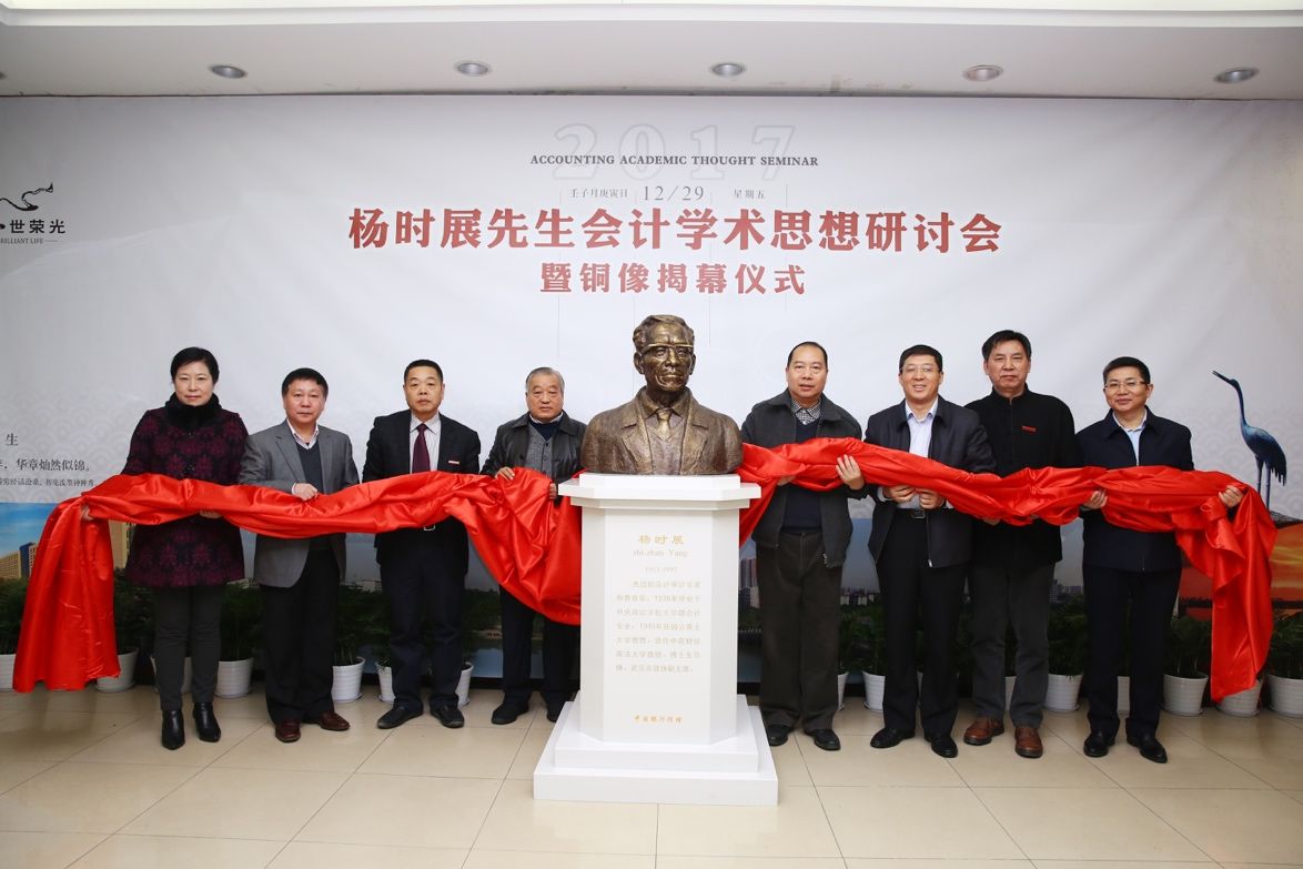 (通讯员 孙煜婷 徐会超 严丽娜 赵侃)2017年12月29日上午9:00,杨时展先生会计学术思想研讨会暨铜像揭幕仪式在文泉楼南401会议室隆重举行。中国银行湖北省分行党委书记、行长葛春尧先生,党委委员、副行长马强先生,中南财经政法大学文澜资深教授郭道扬教授、校党委书记栾永玉教授、校长杨灿明教授、原党委书记徐敦楷教授、副校长姚莉教授、校长助理邹秉国研究员、湖北省审计厅副厅长焦跃华教授、学校办公室阮世喜主任、校档案馆徐警武馆长、校友总会办公室万莉副主任,中国银行湖北省分行办公室主任石先宝先生,中国银行湖北省分行武汉东湖开发区支行行长杨晓华女士,杨时展先生指导毕业的学生代表张杰明教授、汪祥耀教授、罗飞教授、张龙平教授、文善恩先生、庄丹先生,杨时展先生指导毕业的硕士代表高文进副教授,杨时展先生家属代表杨季音、杨晟、杨昂,杨先生好友及家乡代表杜建军教授、梁林美先生、王伯钱先生,银河院长张敦力教授、院党委肖翠祥书记、院党委王延副书记、副院长王雄元教授、副院长王华教授、会硕中心主任郭飞教授及全院教师参与了本次活动。活动分为两个部分,第一部分为开幕式暨铜像揭幕仪式,第二部分为追忆与研讨杨时展先生会计学术思想环节,分别由银河院长张敦力教授和注册会计师行业发展研究中心主任张龙平教授主持。