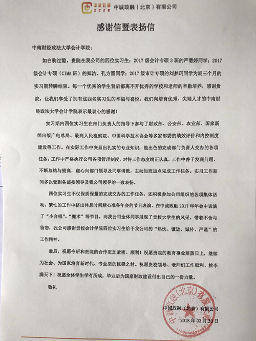 (向传殿刘梦珂)近日,中诚政融(北京)有限公司(以下简称:中诚政融)向yh86银河国际(会硕中心)发来感谢暨表扬信,高度赞扬了学院(中心)专业硕士研究生培养的制度设计和人才培养模式,对4位实习生在实习期间所表现出来的业务能力和综合素质给与了充分的肯定和高度评价,对学院(中心)对该公司工作的支持表示衷心感谢!