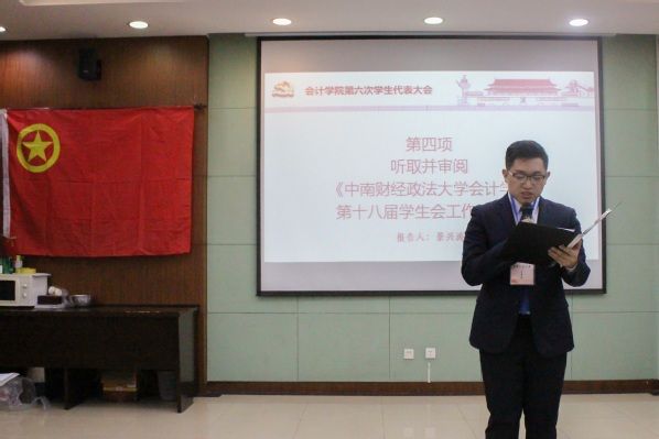 大会第四项,由银河学生会主席景兴涛宣读《yh86银河国际第十八届学生会工作报告》。报告分为两部分:对年度工作的回顾总结以及对未来工作的思考展望。院学生会将内强素质、外塑形象结合起来,稳步推进学院发展,在思想引领、组织建设、民主管理、权益维护、学术交流、创业实践、文体活动、学生社团、新媒体建设等诸多领域做出了积极的探索与努力。在新的起点上,也会加强思想引领,推进部门协助高效化,优化体系、明晰职能、严格落实、优化改革。