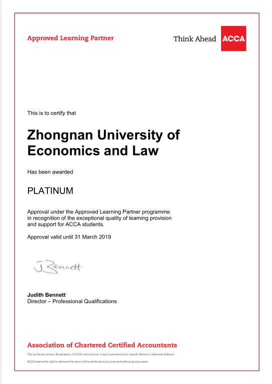 (撰稿:刘东晓 审稿:詹雷)5月20日,中南财经政法大学白金级认可培训机构的申请获得ACCA(特许公认会计师公会)总部批准,我校正式成为ACCA全球最高等级的合作伙伴。ACCA认可培训机构分为黄金级和白金级两种,我校于2014年5月获得黄金级资格,经过数年努力,2018年5月成功晋升为白金级,同时也成为继西安交通大学、上海财经大学等之后全国第8所获此殊荣的高校。