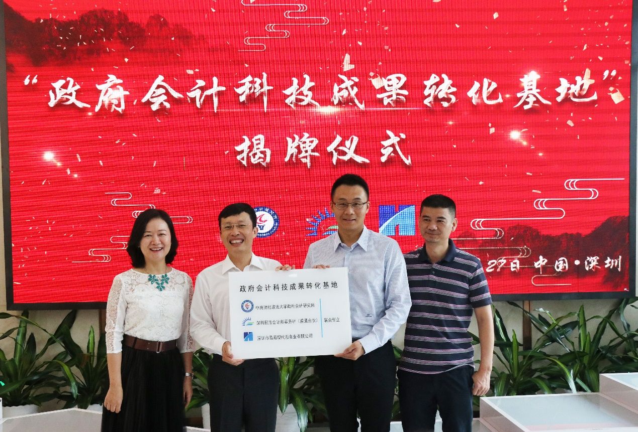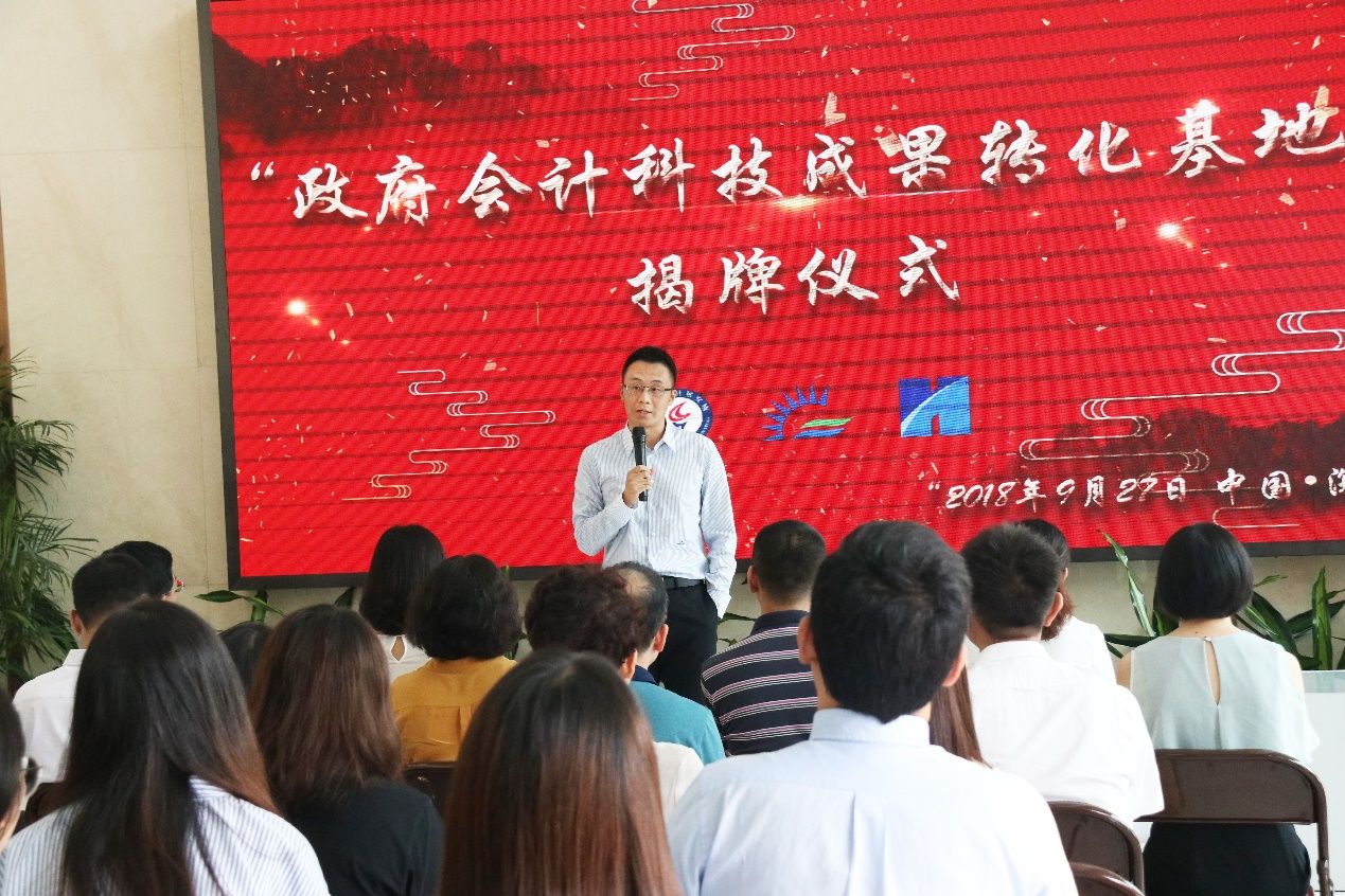 为了更好地服务政府会计改革研究,搭建产学研一体化平台,推进理论与实务交流,日前,中南财经政法大学政府会计研究所(简称政府会计研究所)与深圳日浩会计师事务所(普通合伙)(简称日浩)、深圳市易海现代服务业有限公司(简称易海)达成协议,共同设立了“政府会计科技成果转化基地”(简称“科技基地”)。2018年9月27日上午10点,“科技基地”的发起方,在深圳南山科技园的北理工创新大厦举行了隆重的揭牌仪式。深圳市会计学会万美娜会长,深圳市社会组织总会联合党委张武波副书记,中南财经政法大学政府会计研究所所长张琦教授、潘晓波副教授,深圳日浩首席合伙人杨光先生、合伙人王芳女士、合伙人温兴一,深圳易海CTO林海如先生等50余位来宾参加了此次揭牌仪式。